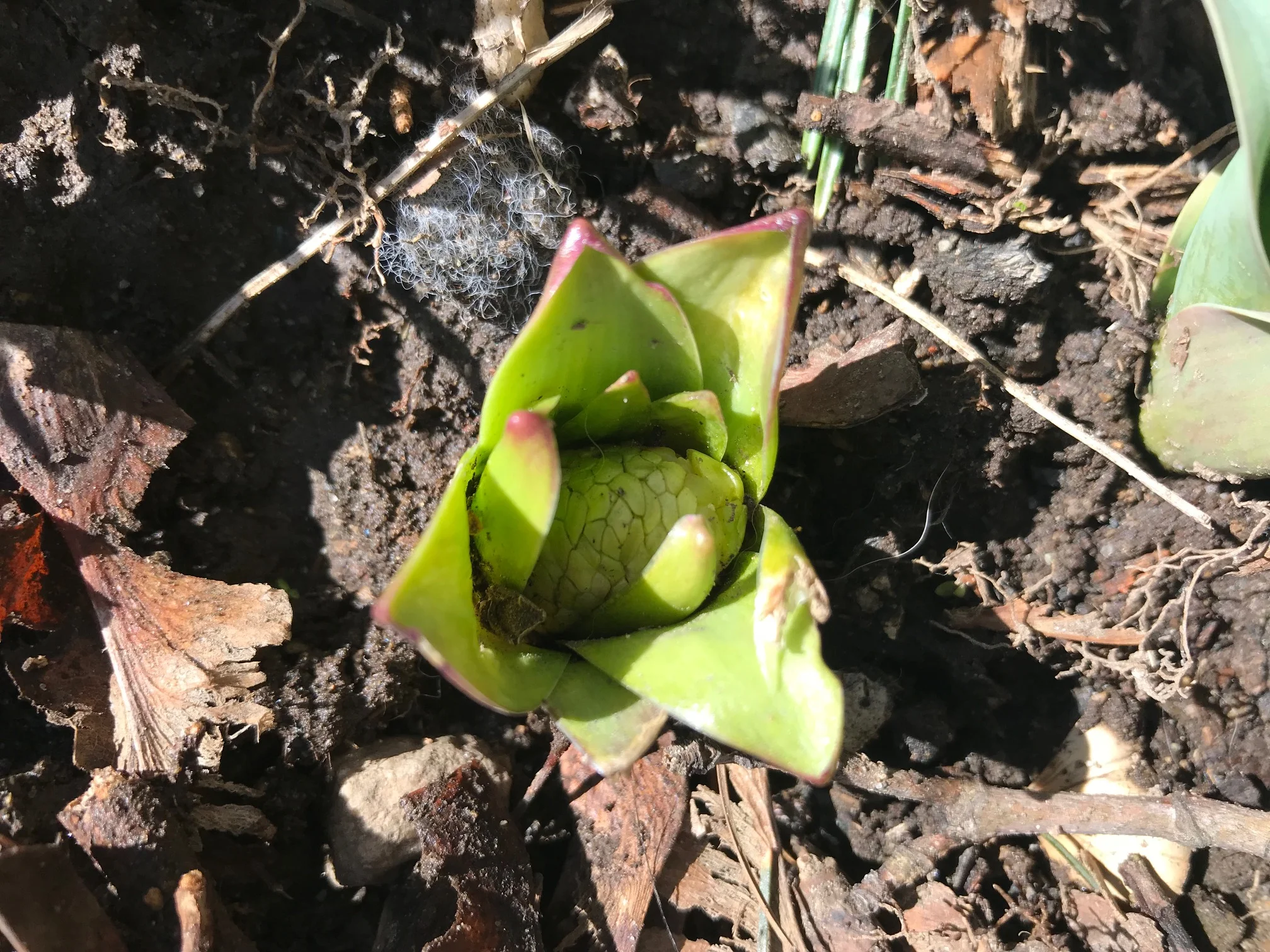 Bed Two: Orange, Peach, and Yellow. The next bed is crocus, hyacinth and tulips all of which seem to be emerging. The Crocus are blooming and seem to have faired slightly better than the Scilla in the snow. I believe the picture below is the hyacinth starting to bud. It looks otherworldly in there.